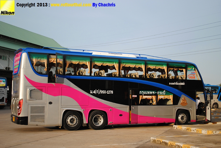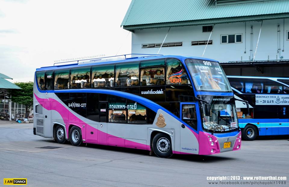 สาย 950 กรุงเทพฯ-เขาพนม-กระบี่ Bkk-Khaophanom-Krabi เวลาต้นทาง (Go) 20.00 ม.4ข (11.30 ชม./นาที) 19.30 ม.4ก (11.30 ชม./นาที) เวลาปลายทาง (Back) 17.30 ม.4ข 17.00 ม.4ก อัตราค่าโดยสาร (Fare) เขาพนม/กระบี่ 542/569 บาท ปรับอากาศชั้น 1 (ข) 843/885 บาท ปรับอากาศวีไอพี (ก) ใช้เส้นทาง พระรามสอง มหาชัย จ.สมุทรสงคราม วังมะนาว อ.เขาย้อย จ.เพชรบุรี อ.ชะอำ อ.หัวหิน อ.ปราณบุรี อ.สามร้อยยอด อ.กุยบุรี จ.ประจวบคีรีขันธ์ อ.ทับสะแก เขาโพธิ์ อ.ท่าแซะ แยกปฐมพร อ.สวี เขาปีบ อ.หลังสวน อ.ละแม อ.พุนพิน บ้านส้อง อ.เวียงสระ อ.พระแสง บ้านม่วงงาม อ.ชัยบุรี อ.เขาพนม อ.เหนือคลอง บ้านตลาดเก่า จ.กระบี่ -------------------------------------------------------------------------------------------------------------------- ![]() ![]() ![]()