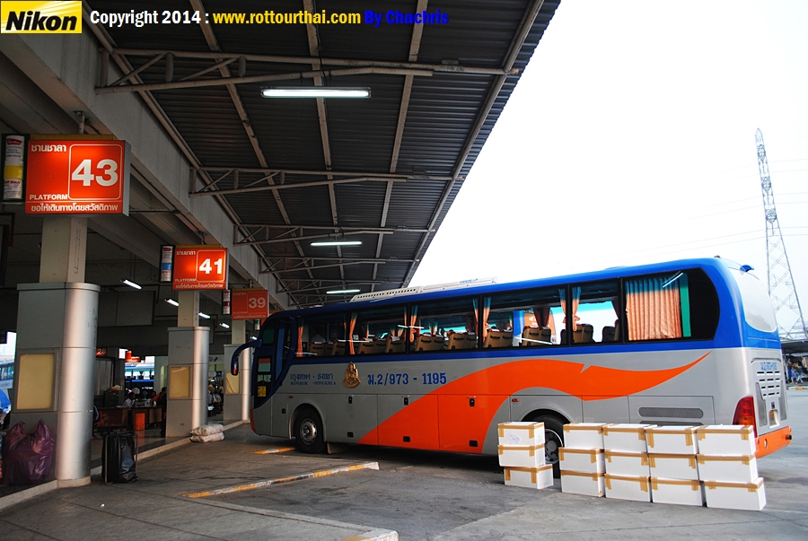 สาย 973 กรุงเทพฯ-สงขลา Bkk-Songkhla เวลาต้นทาง (Go) 06.50,18.00 ม.2 (13 ชม.) 16.00 ม.4ข (13 ชม.) เวลาปลายทาง (Back) 07.30,15.00 ม.2 14.30 ม.4ข อัตราค่าโดยสาร (Fare) 539 บาท ปรับอากาศชั้น 2 693 บาท ปรับอากาศชั้น 1 (ข) ใช้เส้นทาง พระรามสอง มหาชัย จ.สมุทรสงคราม วังมะนาว อ.เขาย้อย จ.เพชรบุรี อ.ชะอำ อ.หัวหิน อ.ปราณบุรี อ.สามร้อยยอด อ.กุยบุรี จ.ประจวบคีรีขันธ์ อ.ทับสะแก เขาโพธิ์ อ.ท่าแซะ แยกปฐมพร อ.สวี เขาปีบ อ.หลังสวน อ.ละแม จ.สุราษฎร์ธานี อ.กาญจนดิษฐ์ บ้านใน อ.สิชล อ.ท่าศาลา จ.นครศรีธรรมราช อ.หัวไทร อ.ระโนด อ.สทิงพระ อ.สิงหนคร เกาะยอ บ้านน้ำกระจาย จ.สงขลา -------------------------------------------------------------------------------------------------------------------- ![]()