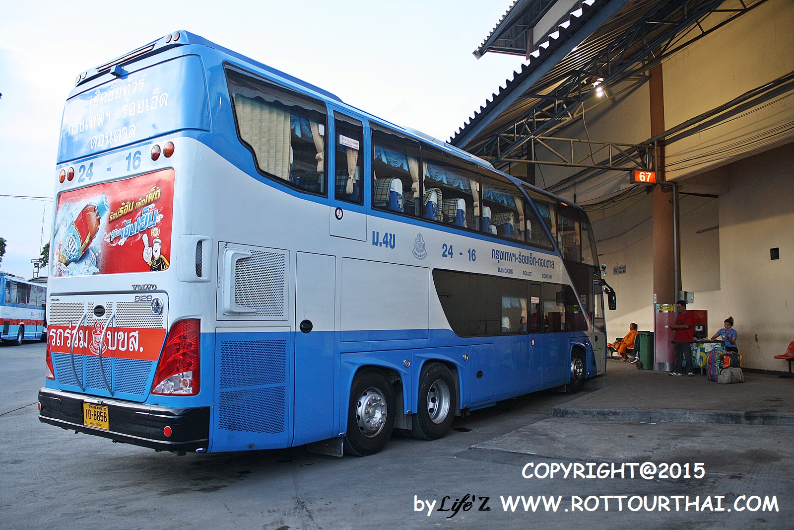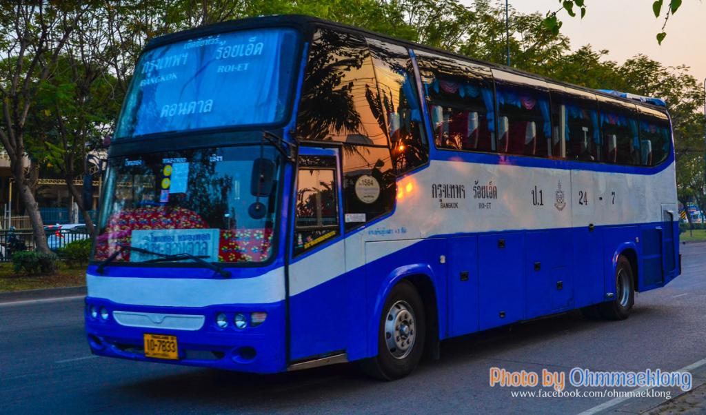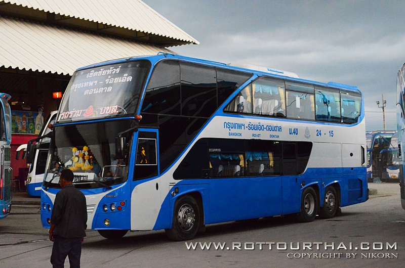 สาย 24 กรุงเทพฯ-เลิงนกทา Bkk-Leangnoktha เวลาต้นทาง (Go) 09.15 ปรับอากาศชั้น 1 (8 ชม.) เวลาปลายทาง (Back) สาย 24 กรุงเทพฯ-ร้อยเอ็ด-ดอนตาล Bkk-Roiet-Dontan เวลาต้นทาง (Go) 18.30,20.40,22.15 ปรับอากาศชั้น 1 (12 ชม.) เวลาปลายทาง (Back) อัตราค่าโดยสาร (Fares) ร้อยเอ็ด/เลิกนกทา/ดอนตาล 392/482/556 บาท ปรับอากาศชั้น 1 (ข) ใช้เส้นทาง อ.วังน้อย อ.หนองแค หินกอง จ.สระบุรี อ.แก่งคอย อ.มวกเหล็ก แยกปากช่อง อ.สีคิ้ว อ.สูงเนิน จ.นครราชสีมา บ้านวัด ตลาดแค อ.สีดา อ.พล อ.บ้านไผ่ อ.กุดรัง อ.บรบือ จ.มหาสารคาม จ.ร้อยเอ็ด อ.ธวัชบุรี อ.โพนทอง อ.หนองพอก อ.เลิงนกทา อ.ดอนตาล -------------------------------------------------------------------------------------------------------------------- ![]() ![]() ![]() ![]()